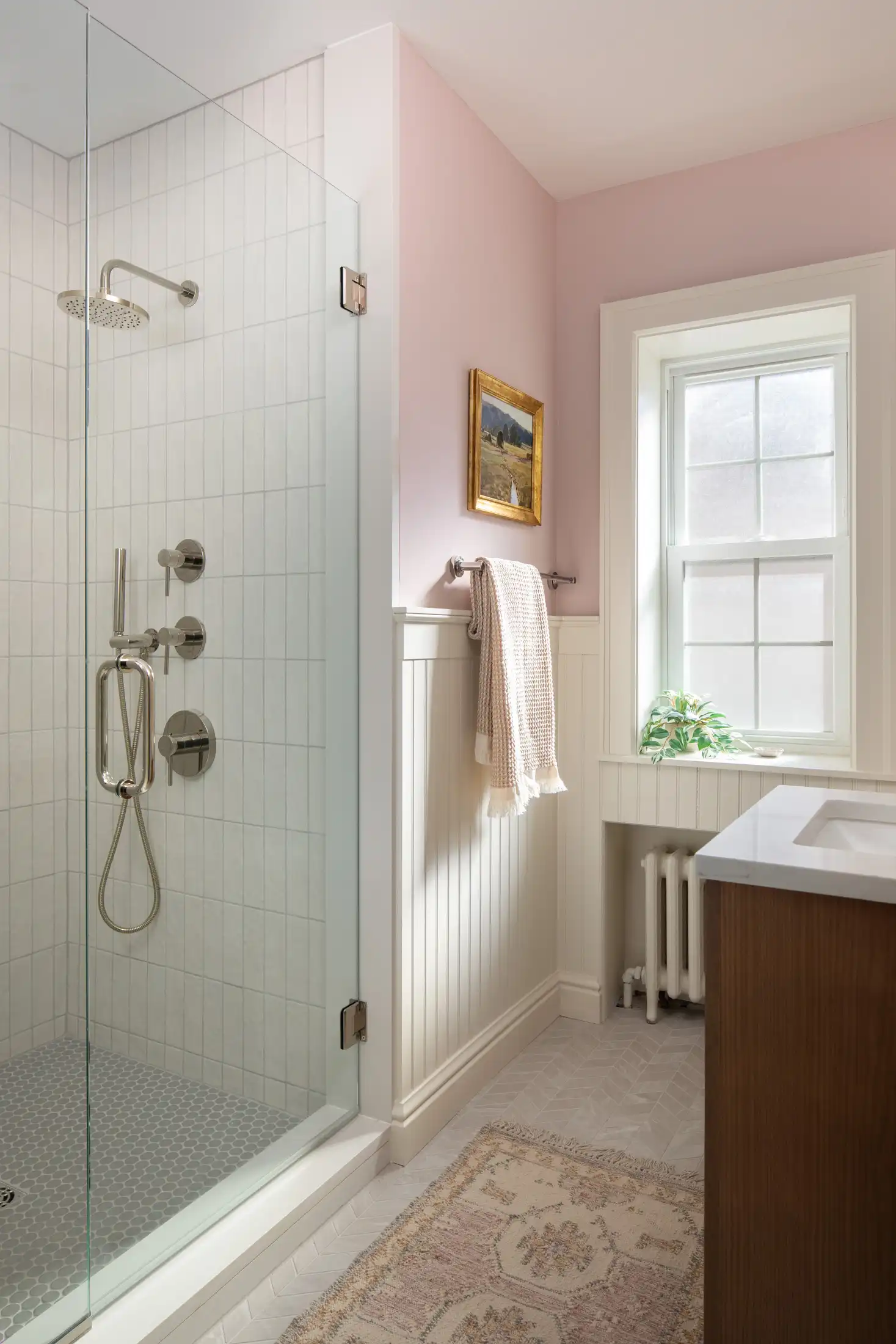 The bathroom features stacked tile in the shower for a clean, transitional look, paired with wainscot paneling and trim details crafted to seamlessly match the home’s existing architecture. The result is a space that feels completely at home within the house while still reflecting her personality.