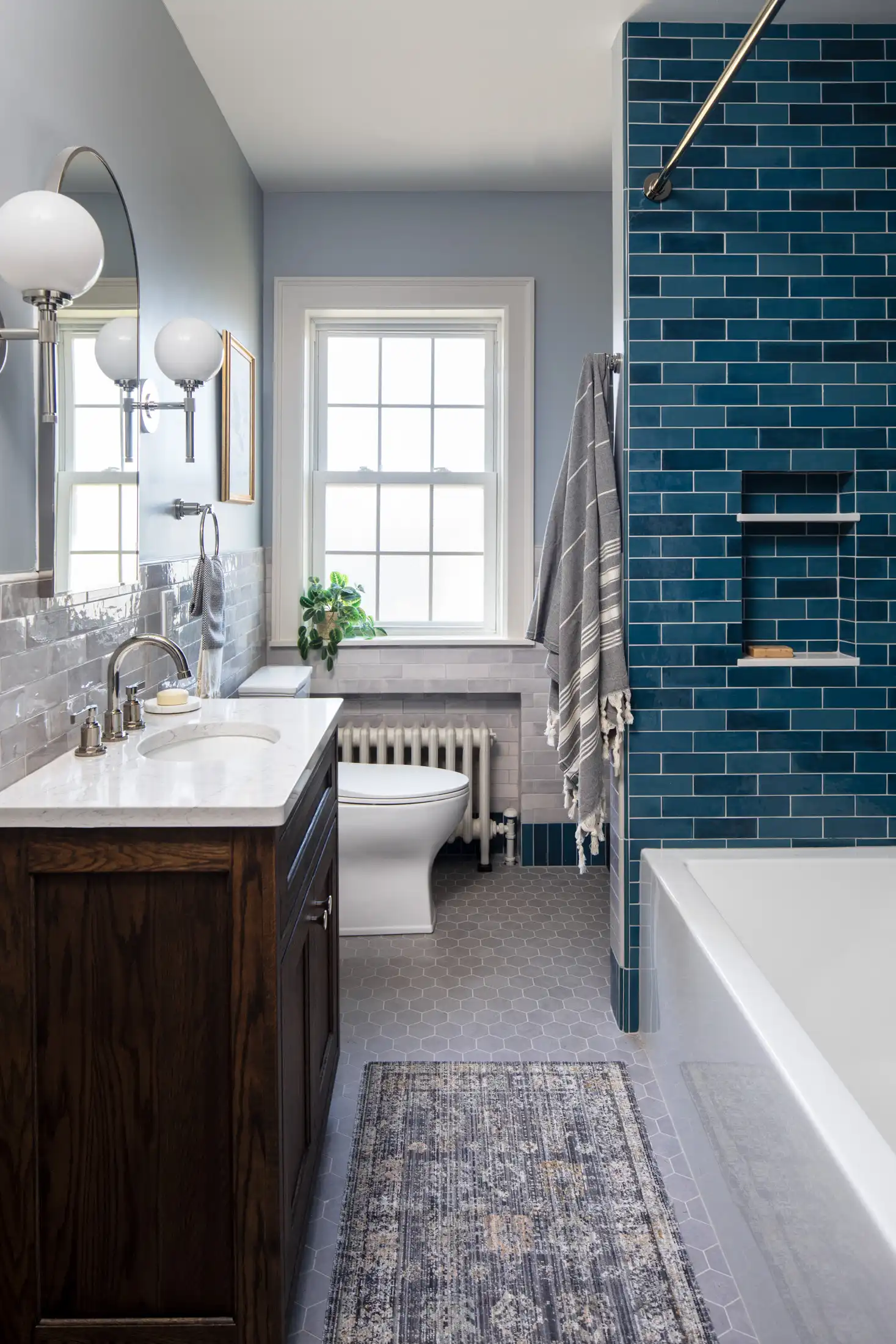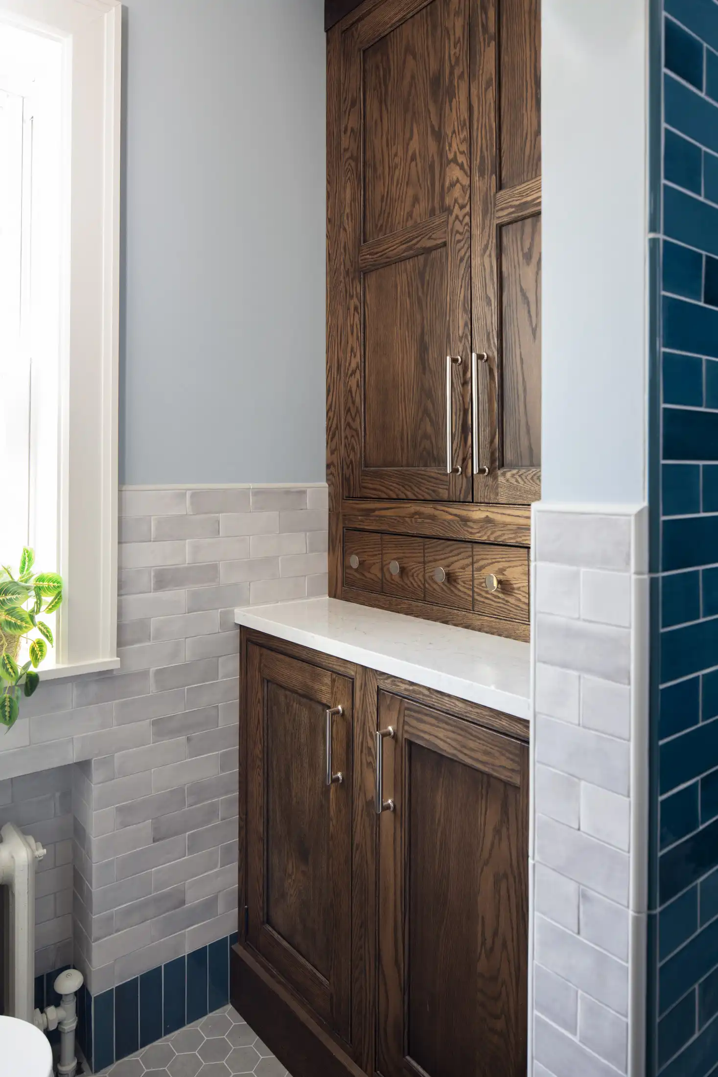 We embraced the family’s love for blue and leaned into the opportunity to give this smaller space a bold personality. Rich wainscoting, patterned tile, and playful color make the room feel both inviting and refined.