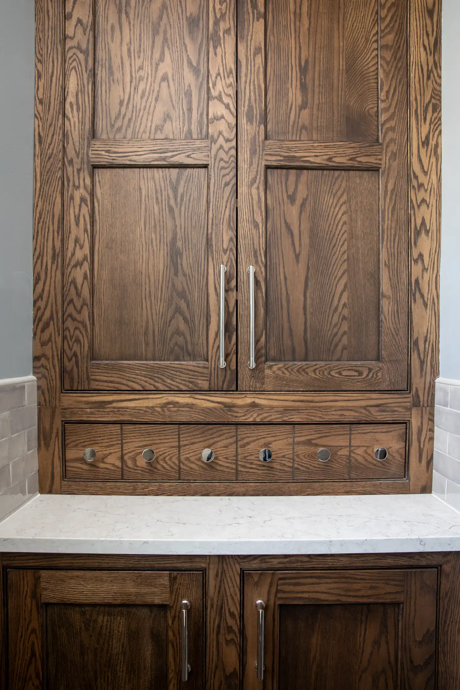 One charming challenge became one of the most memorable features: an existing laundry chute inspired a custom built-in. Designed to resemble a piece of furniture, the inset cabinetry adds valuable linen storage along with apothecary-style drawers that bring character and practicality together.