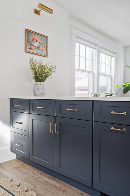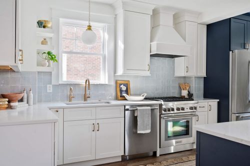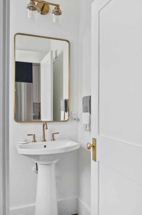 This kitchen and powder room renovation project was designed to transform the main level of a 100+ year old home by enhancing the flow of the space and updating key features while honoring the home's historic character. The homeowners were seeking a more open and efficient kitchen layout with expanded counter and storage space, as well as a seamless connection to the dining room for entertaining. We opened up the floor plan by removing the wall between the kitchen and dining area creating an open concept space ideal for daily living and hosting. The clients wanted a crisp and clean look, which our team helped them envision with bright white cabinetry, new hardwood flooring, custom cabinetry, quartz countertops, a charming backsplash, and pops of honey bronze hardware. As with most older Pittsburgh homes, there was no first floor bathroom, so a new power room was added to the rear of the kitchen to modernize and increase functionality of the space. The result of this kitchen renovation was a bright, welcoming, and highly functional space that preserves the character of the historic home while meeting the modern needs of its residents.