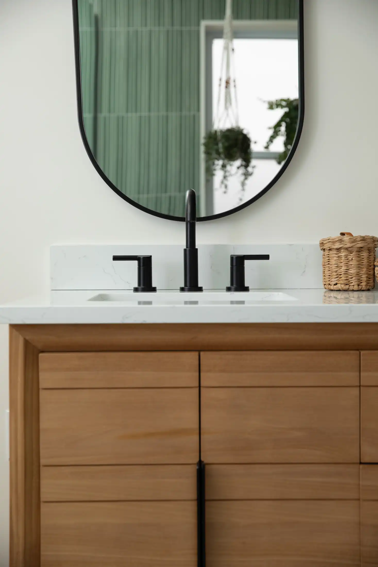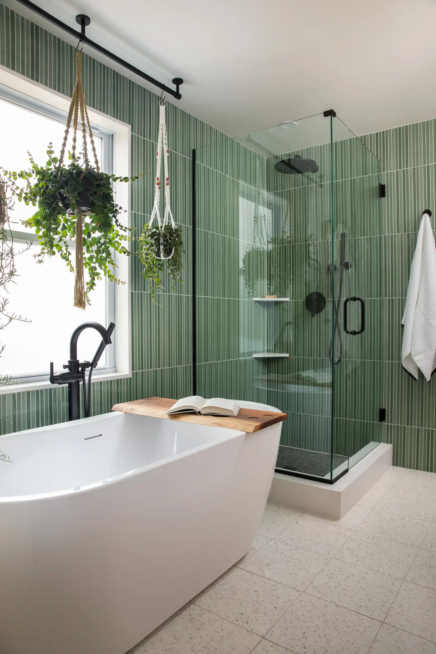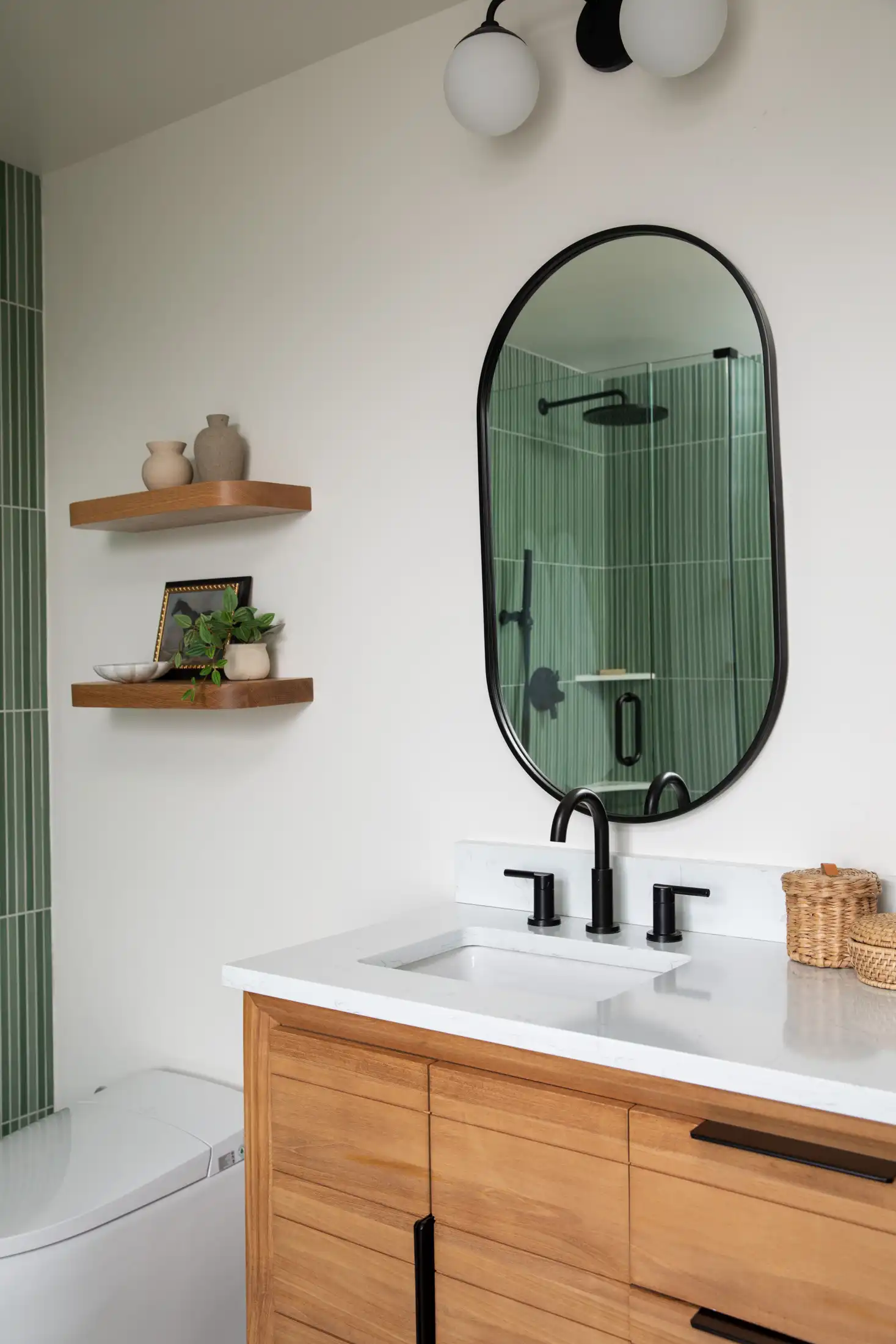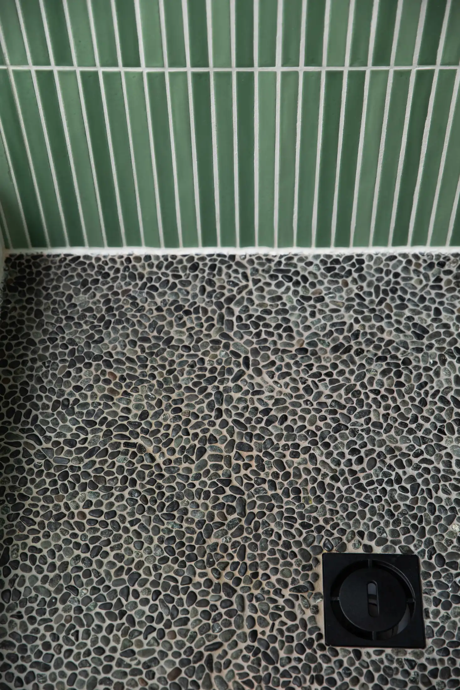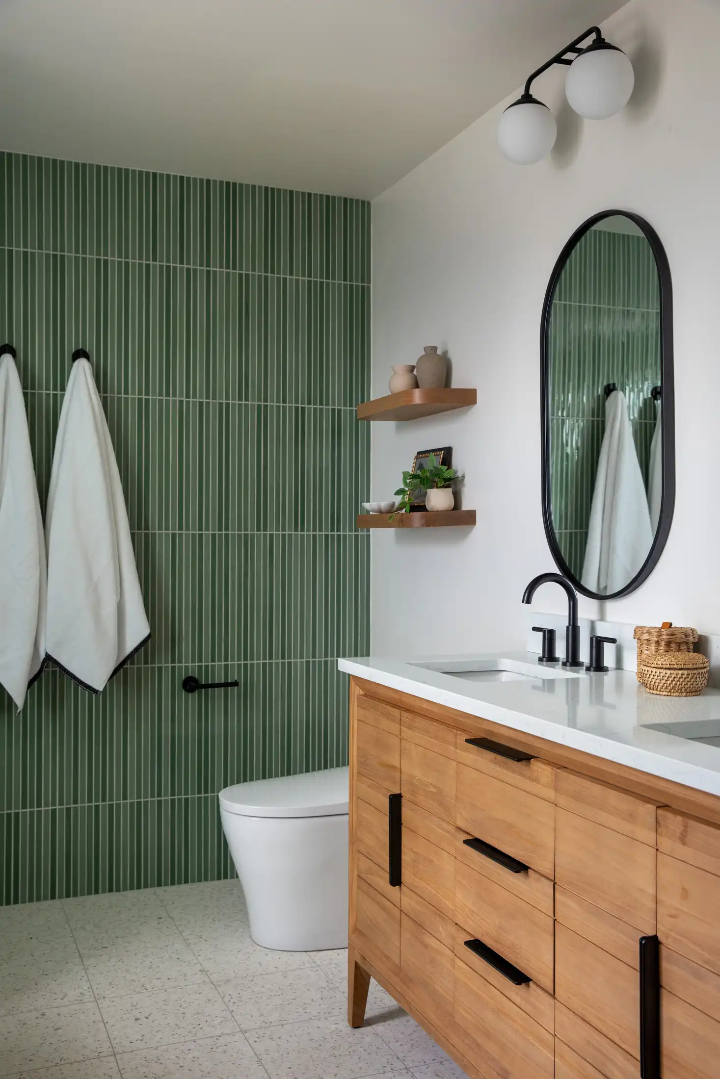 The foundation of the design is the elongated green tile, installed floor-to-ceiling in key areas to create a calming sense of height and rhythm. Its soft vertical lines and natural variation bring a spa-like tranquility to the room. Matte black fixtures add a modern edge and striking contrast, grounding the palette without overpowering the subtle textures.