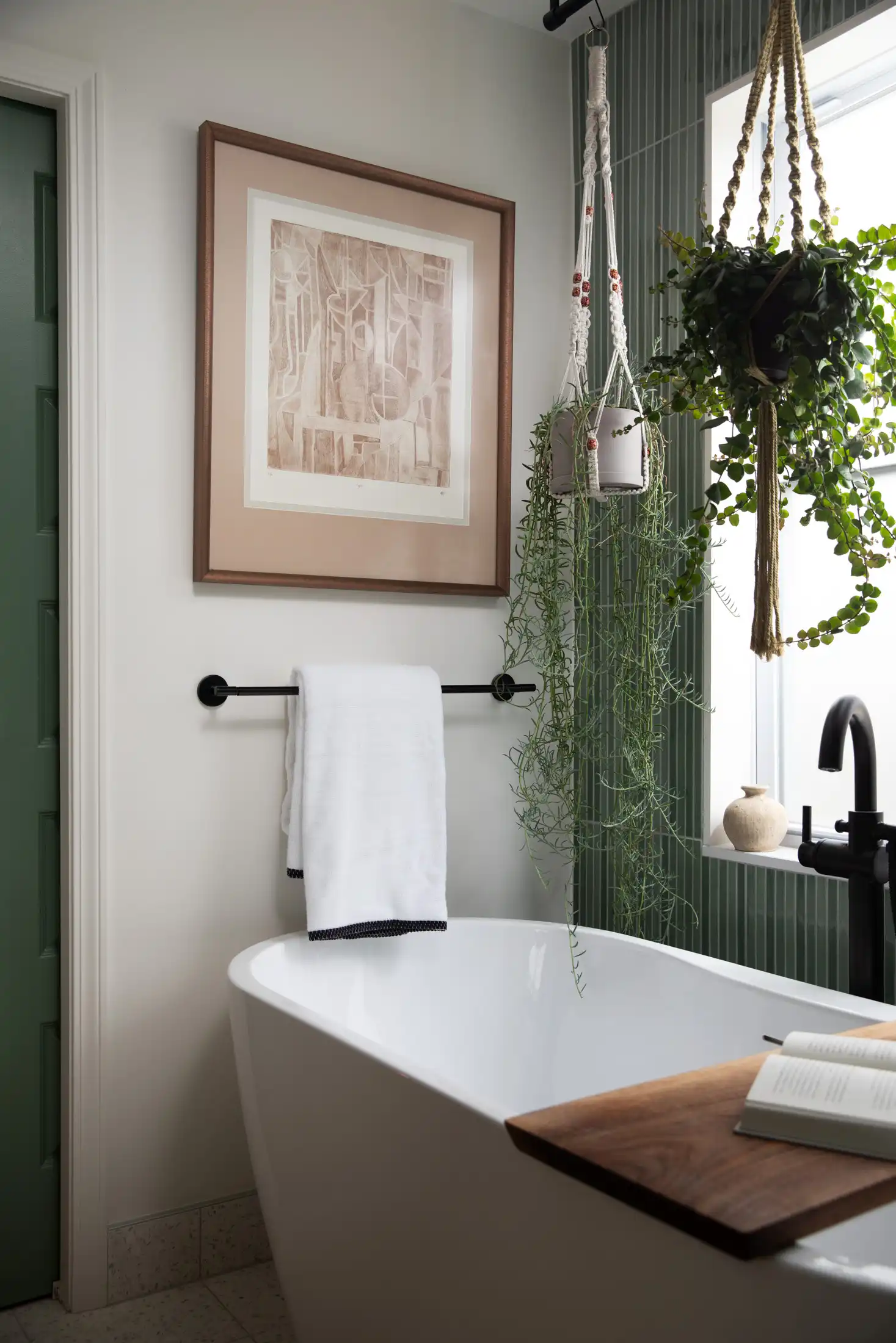 A soaking tub was essential to her daily ritual, and we carved out the perfect place for it, flooded with natural light from the adjacent window. To honor her love of plants and organic elements, we incorporated ceiling-mounted hangers that allow greenery to cascade into the space, enhancing the peaceful, nature-inspired atmosphere.